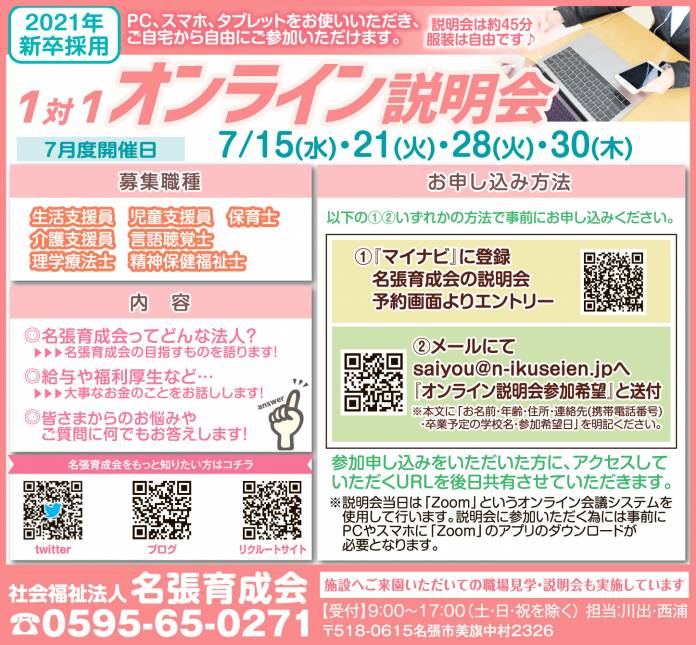 2021年新卒採用向け【1対1】オンライン説明会開催 7/15(水)・21(火)・28(火)・30(木)<社会福祉法人 名張育成会> | 【伊賀タウン情報 YOU】 - YOU