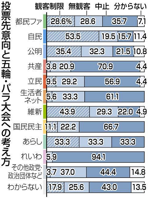 無観客開催を主張する都民ファーストの会に投票すると回答した人も「観客を制限して開催」の28・6%のほか、「中止」が最多の35・7%を占めた。また現時点で投票先を「わからない」としている人のうち、4割強が「中止」を選択し、開催への疑問が根強い傾向が出ている。